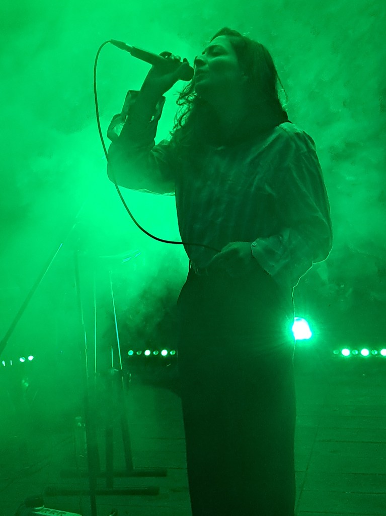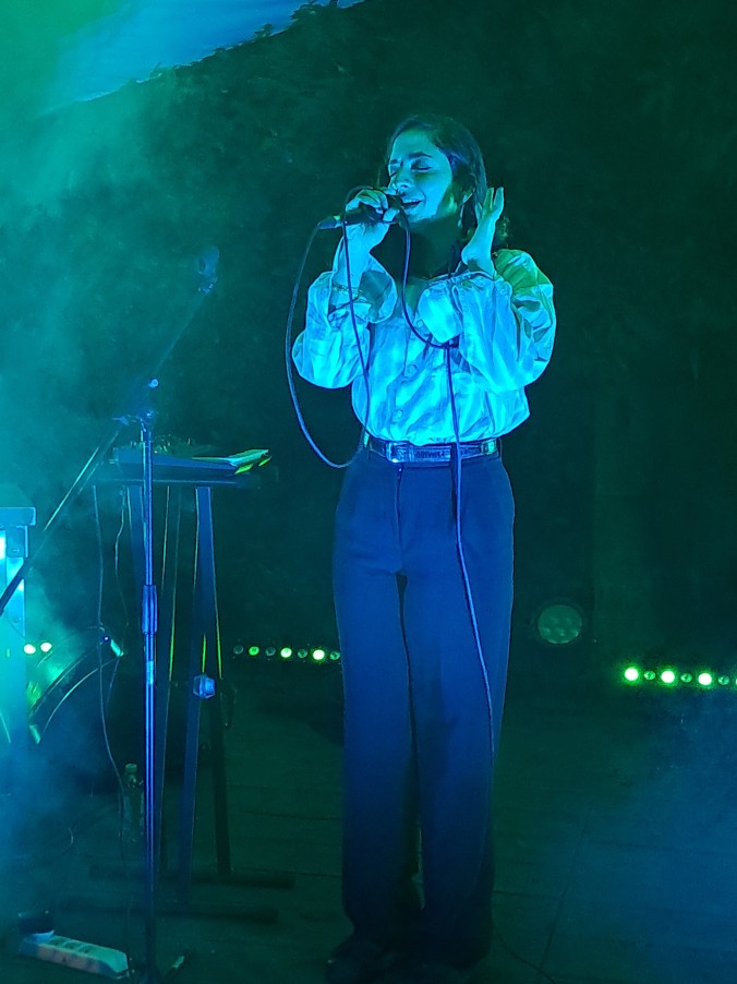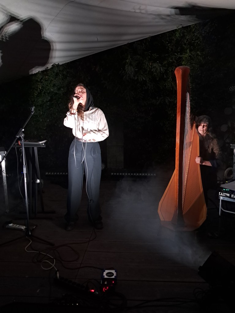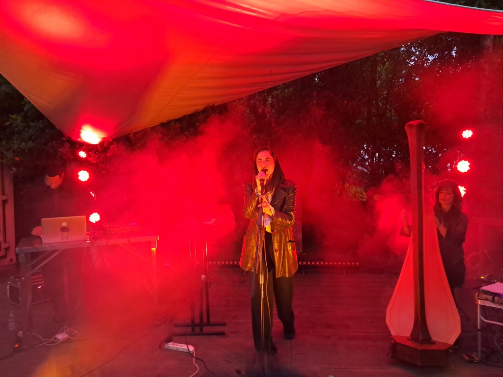 Il basso palco è una pala d’altare perfettamente tripartita: sulla sinistra, il laptop di Ismail Hosni; al lato opposto, la maestosa arpa di Sarah Pagé; occhi bassi e movenze legnose, Nadah è controvoglia al centro. Il look è quantomai spartano, con un lungo cappotto di pelle a coprire una camicia a righe da cui spunta un hijab nero. Durante tutta l’esibizione, rassettare il velo costituirà il tic prediletto della cantante, come se assorbisse una misteriosa energia da un simbolo identitario tanto potente.